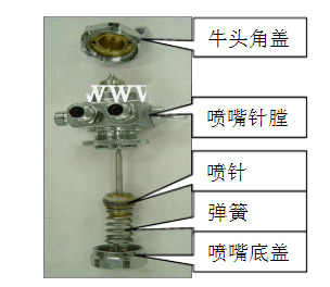 (7)清理干凈后的部件在噴針膠圈位加適量高溫油,將噴針裝入噴針膛內(nèi),裝入彈簧蓋上底蓋,再將頂部牛頭角蓋裝上。